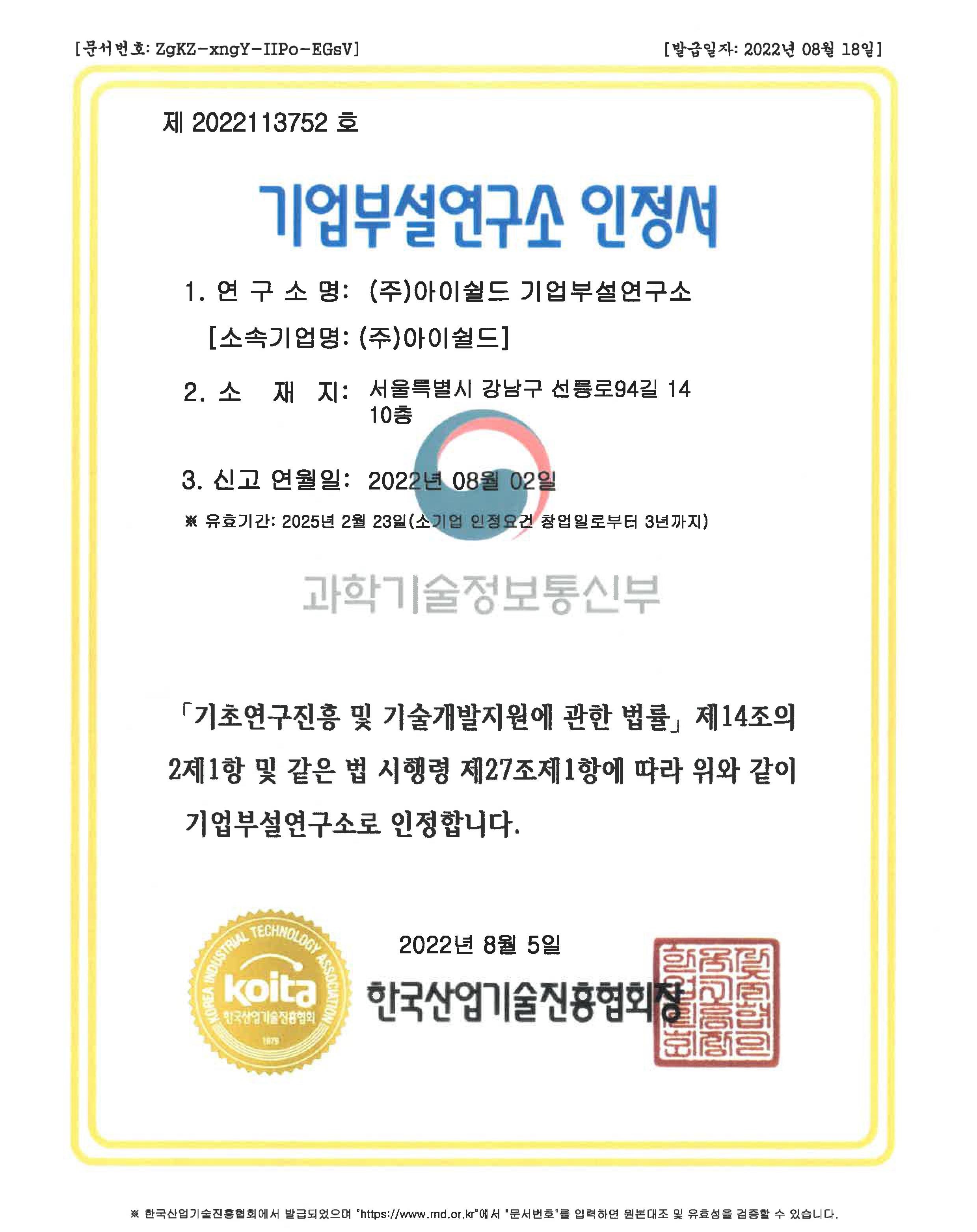 한국산업기술진흥협회 기업부설연구소 인증