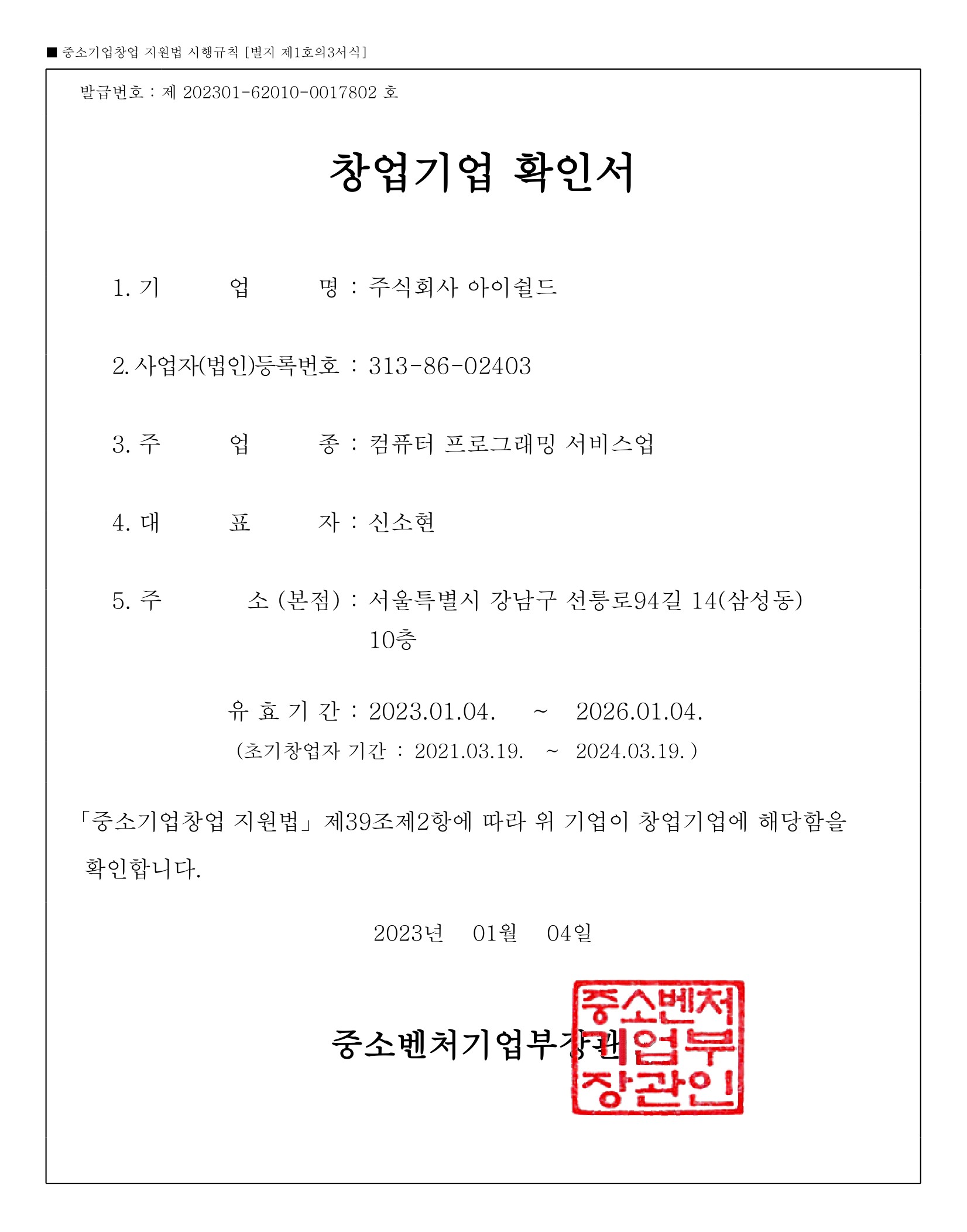중소벤처기업부 창업기업 확인서