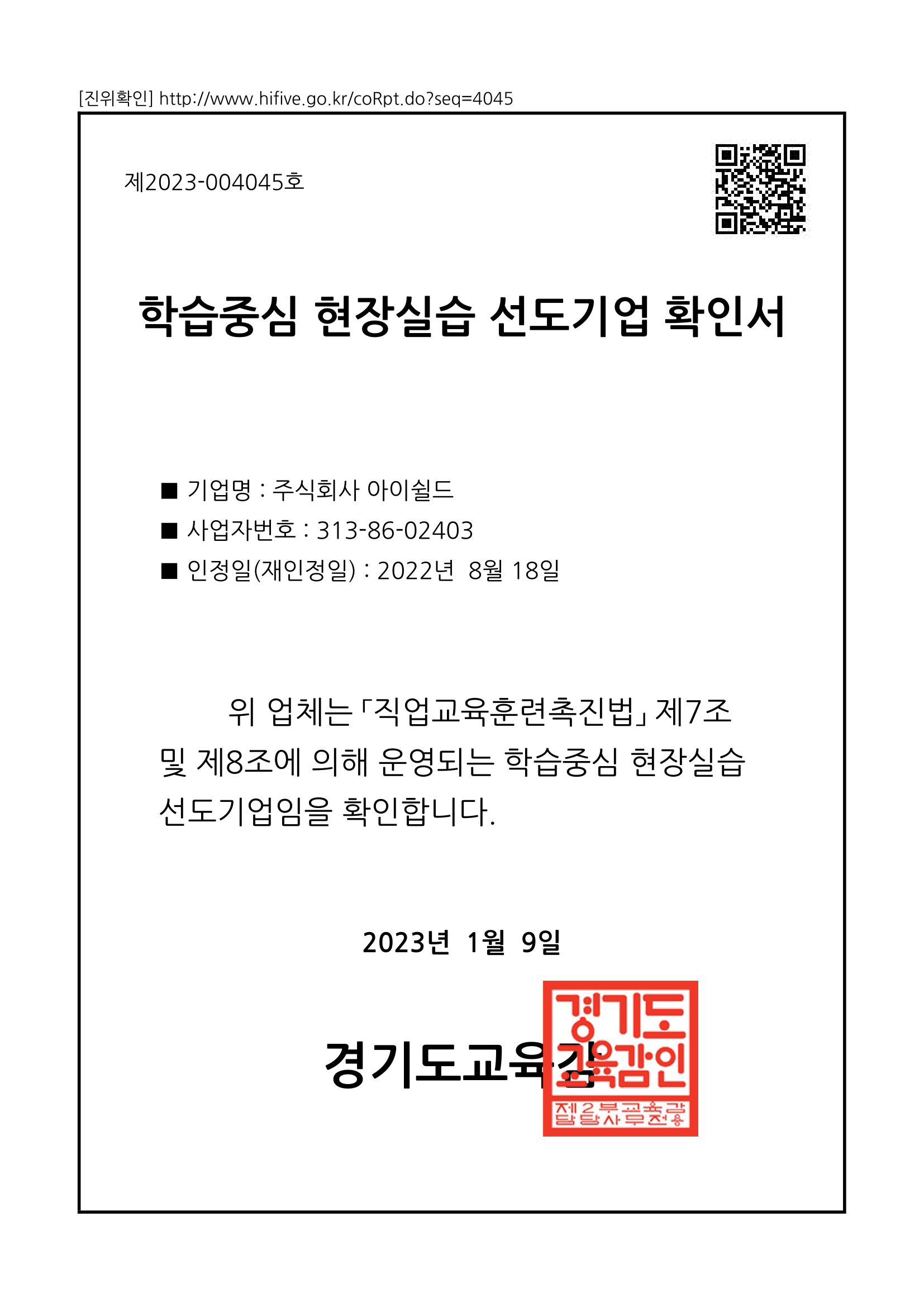 학습중심 현장실습 선도기업 확인서