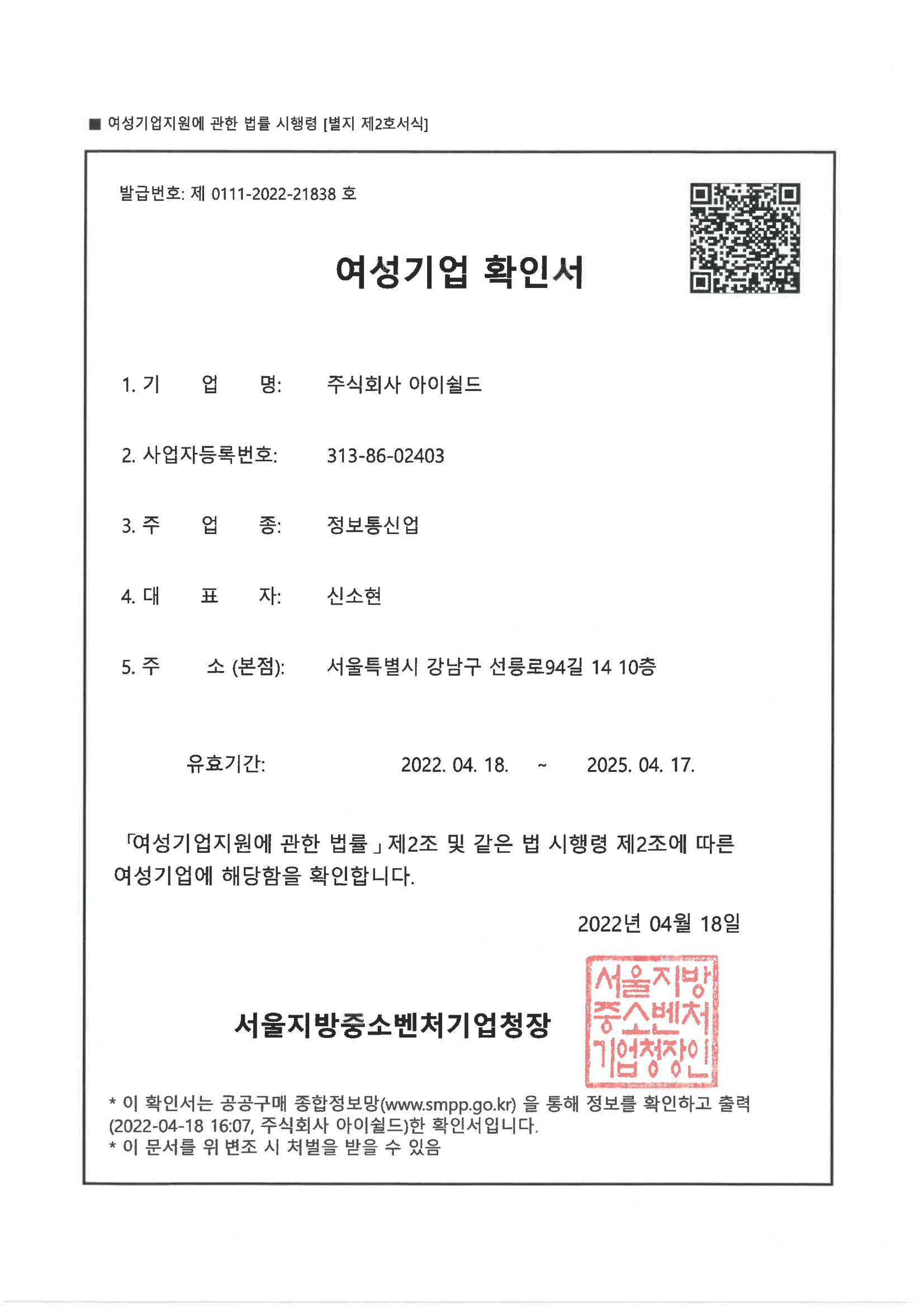 서울지방중소벤처기업청장 여성기업 확인서