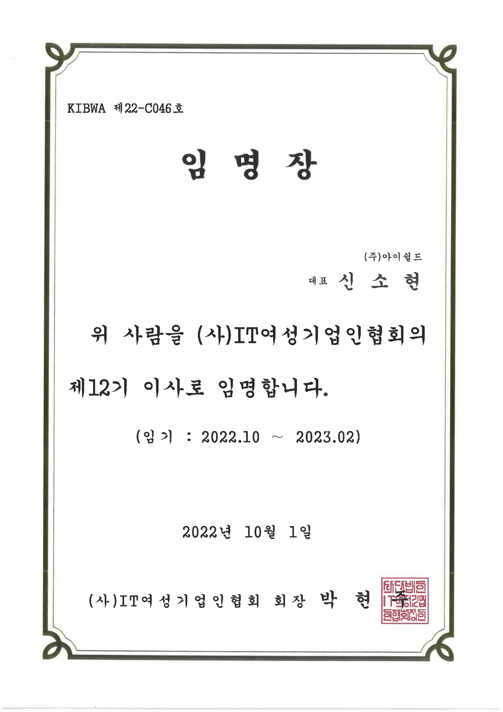 IT여성기업인협회 임명장