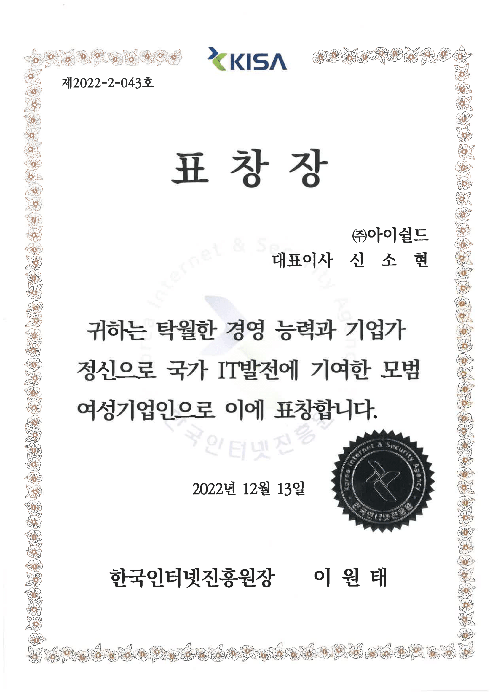 한국인터넷진흥원 KISA 표창장